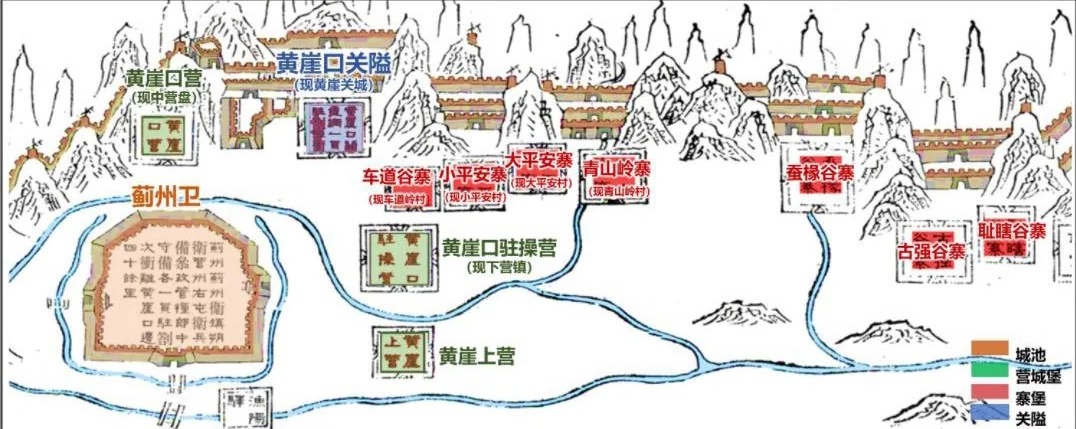 从“雄武城”到“黄崖关”,禄山北筑雄武城,旧防败走归其营。,系书请问燕耆旧,今日何须十万兵。——杜甫《渔阳》。诗里的“雄武城”,就是蓟北的黄崖关。明弘治年间沿长城设立九个军事重镇,辽东镇、蓟州镇、宣府镇、大同镇、太原镇、延绥镇、宁夏镇、固原镇、甘肃镇,蓟州镇便是蓟州区,范围东自山海关,西至昌平镇边城,延袤二千二百余里,戚继光作为蓟辽总兵,镇守蓟州16年,重修了黄崖关长城,增建凤凰楼、八卦街和许多楼台,黄崖关逐渐成了设施完备的防御工程。清康熙《蓟州志》载:“黄崖关边墙九十三里,东起拦马峪,西至松棚顶,楼台四十五座,墩台八座,边储屯粮地三顷四十九亩七分。”