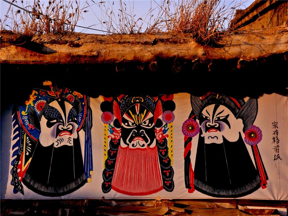 图:北方城村·民居墙上彩绘的戏曲人物剪纸。戏曲人物是蔚县剪纸流派的代表风格之一