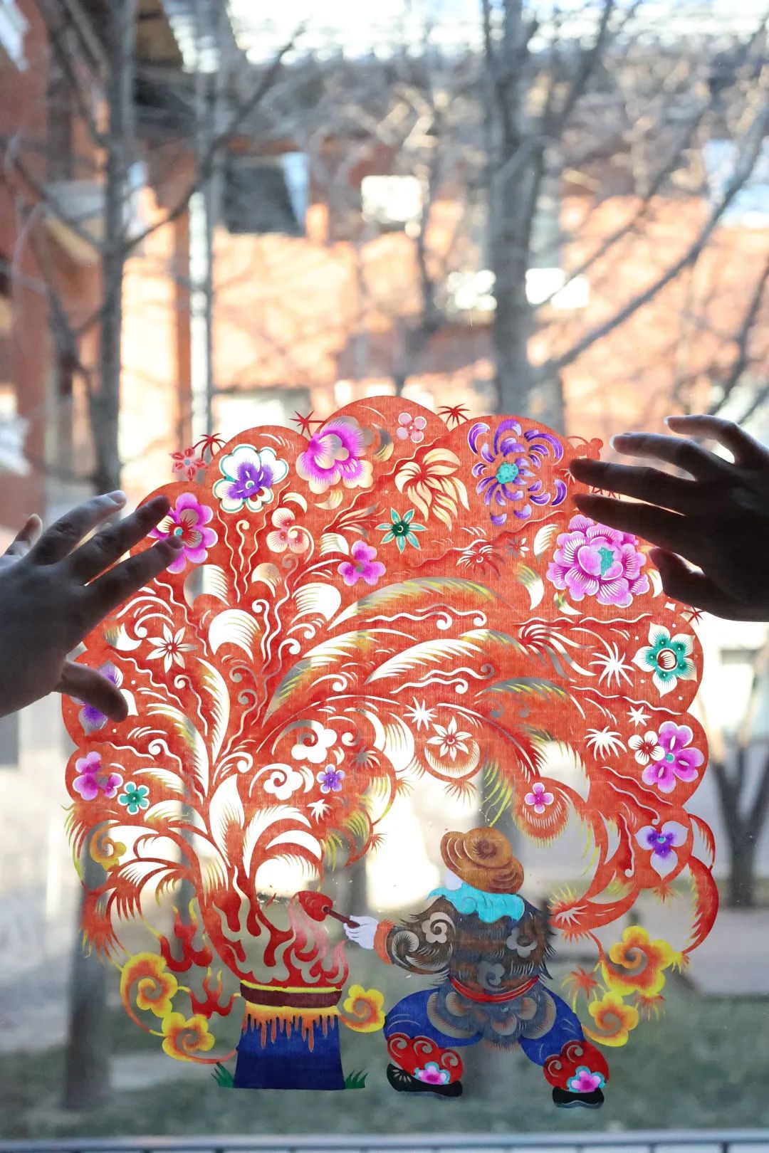 嘴里聊着手里的活儿也不停,只见红纸来回翻转,纸屑簌簌而落,一会儿就满炕的动物、花卉活灵活现。这些妙趣横生的窗花贴在几何图案的木格窗上,在红彤彤的火炕上投下或深或浅的冬日光影。