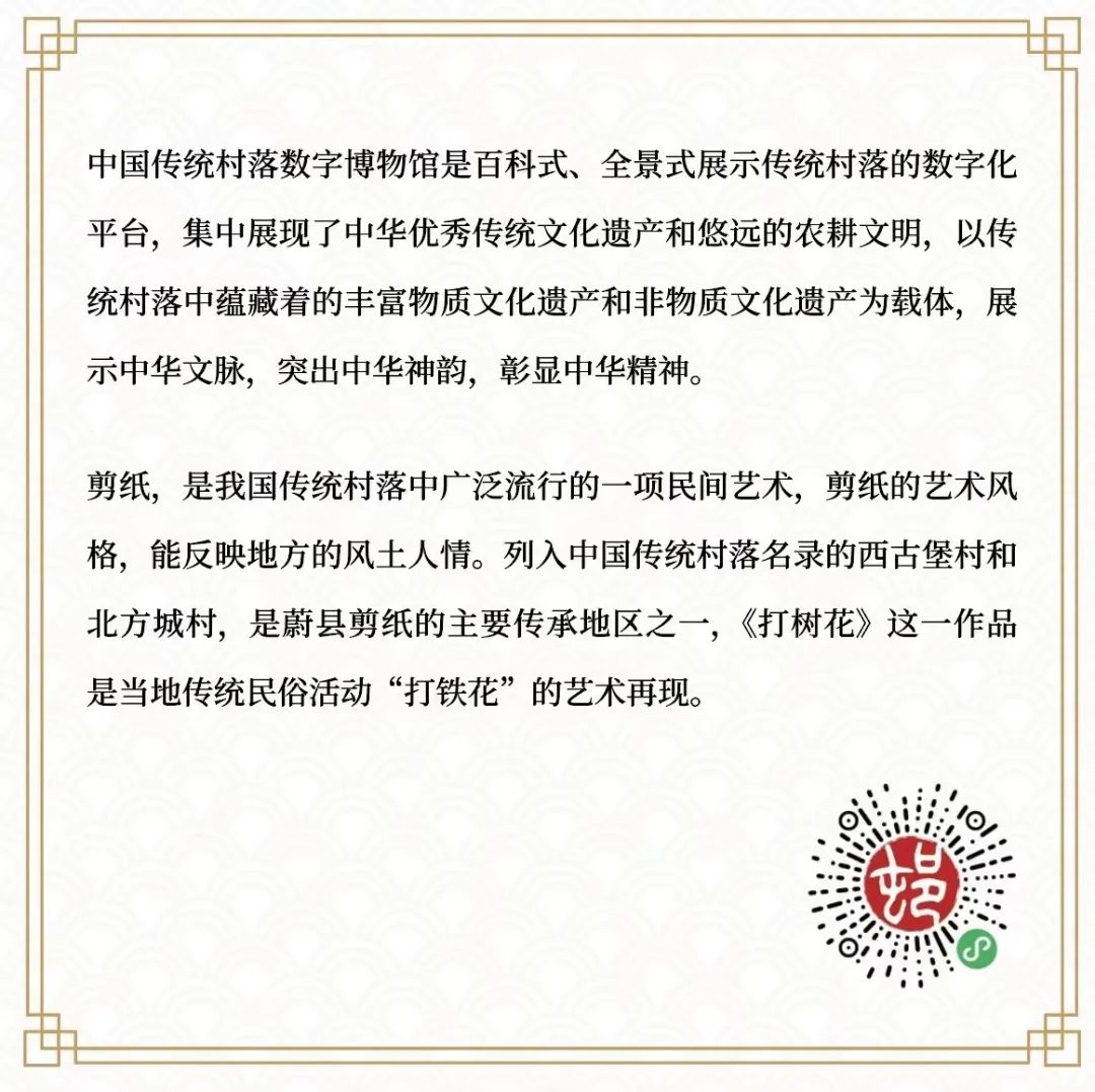主幅剪纸左侧,有“中国传统村落数字博物馆”的渊源以及剪纸艺术的价值。别忘了拿起手机扫一扫,这里有可以让你随时随地遨游村落的小程序端入口。