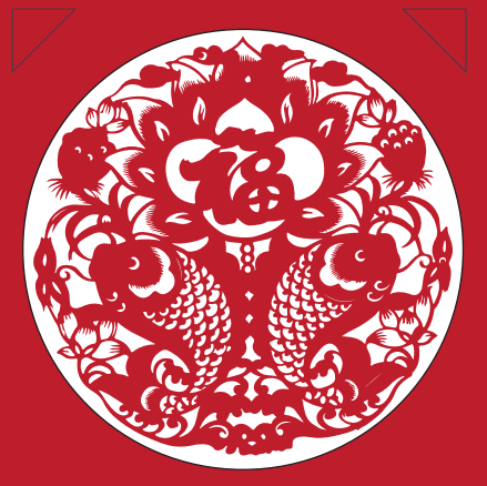主幅剪纸右侧,是传统剪纸的喜庆意象,即花开富贵、连年有余。一个“福”字,变化出万种形态,不变的,是祝福的最本真心意。