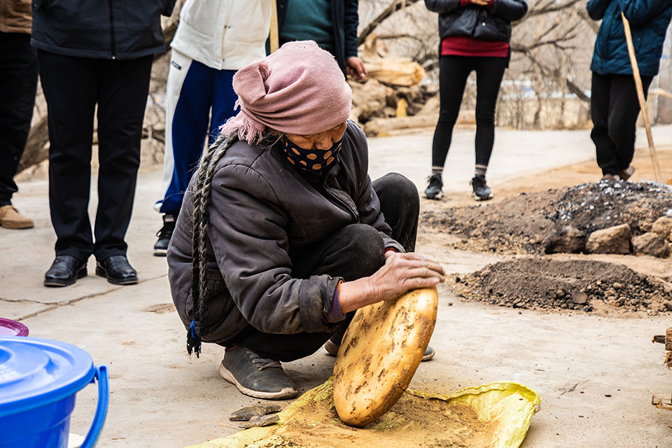 尖巴昂村:村民正在土法烧制小麦粉做的“果馍切”,2002 年“昂拉千斤果馍切”被成功认证为世界最大土烧馍