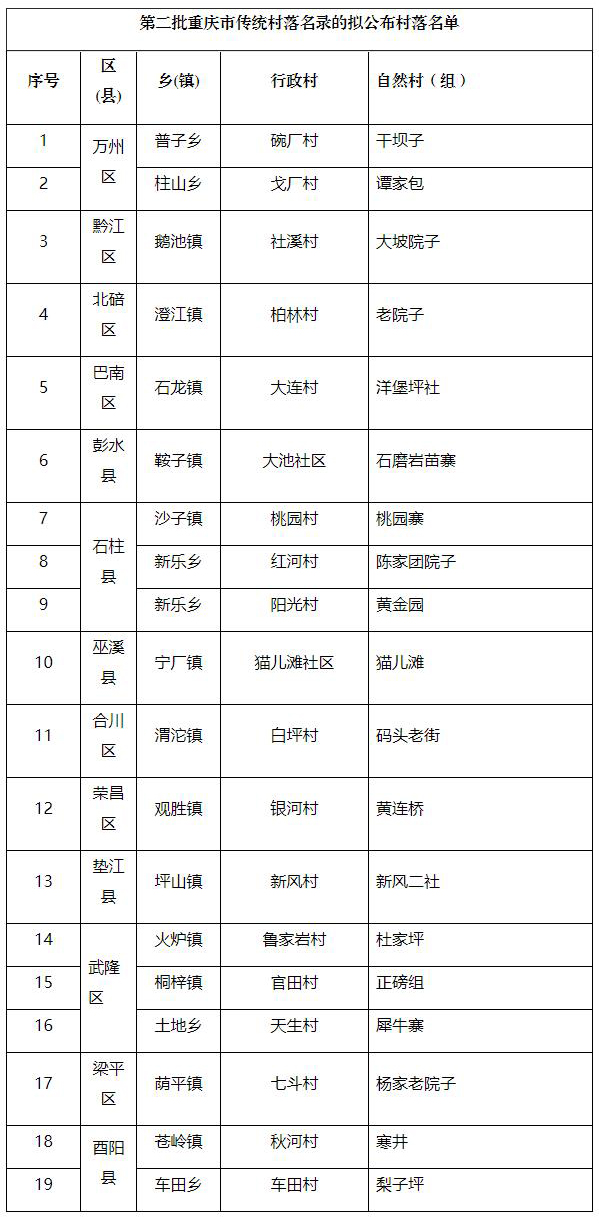 关于拟列入第二批重庆市传统村落名录的村落名单的