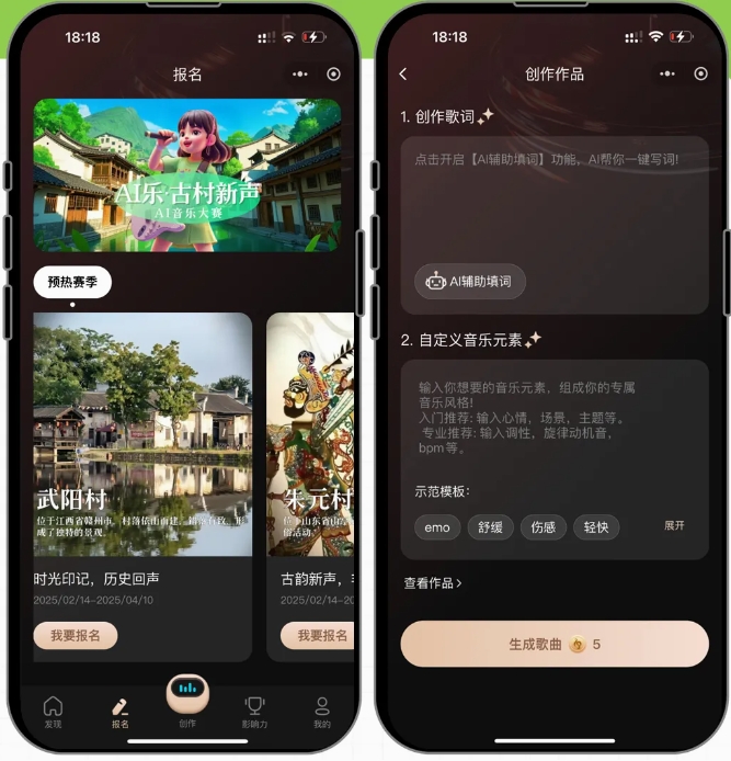 在全面推进乡村振兴与加速传统文化数字化的战略指引下,“AI 乐?古村新声”AIGC音乐大赛应运而生,作为全国首个AI赋能传统村落的音乐赛事,致力于融合前沿科技与深厚乡村文化底蕴。活动以“传承与创新”为核心理念,推出“时光印记,历史回声”“丰收礼赞,田野之歌”“古韵新声,非遗传承”“古村新梦,未来畅想”“人文乡村,和谐乐章”五大主题,通过线上线下活动,为传统村落注入了新鲜血液。